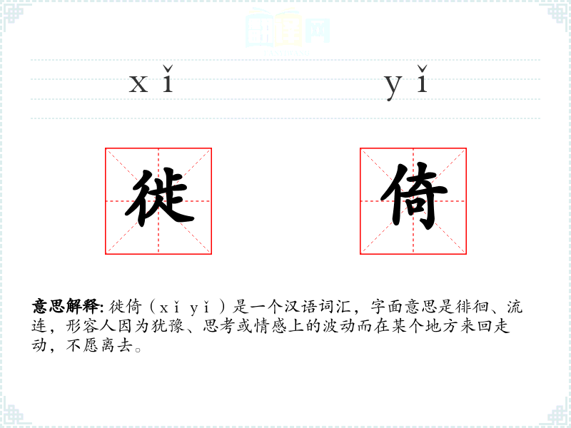 徙倚(xǐ yǐ)是一个汉语词汇,字面意思是徘徊、流连,形容人因为犹豫、思考或情感上的波动而在某个地方来回走动,不愿离去。