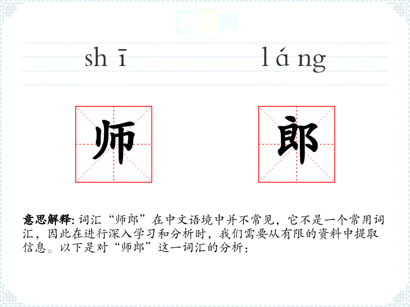 词汇“师郎”在中文语境中并不常见,它不是一个常用词汇,因此在进行深入学*和分析时,我们需要从有限的资料中提取信息。以下是对“师郎”这一词汇的分析: