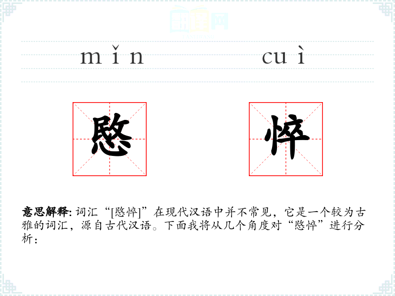 “愍”字最早见于《说文解字》,意为哀怜。“悴”字则有憔悴之意,常见于古文。随着语言的发展,这两个字结合成“愍悴”,表达了一种深切的同情和悲伤。