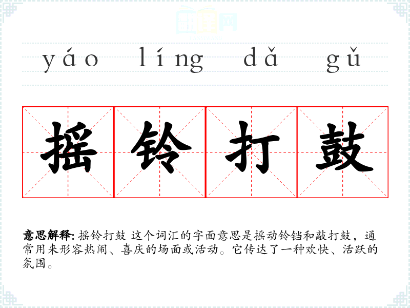 摇铃打鼓 这个词汇的字面意思是摇动铃铛和敲打鼓,通常用来形容热闹、喜庆的场面或活动。它传达了一种欢快、活跃的氛围。