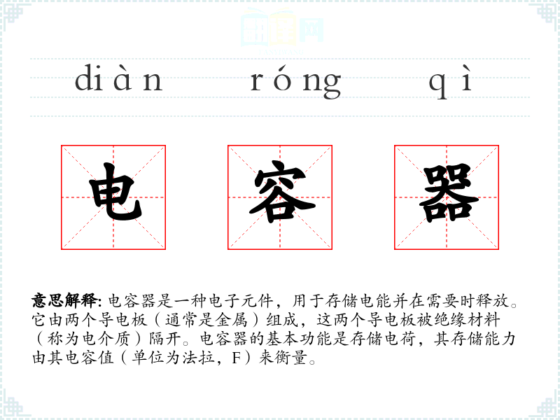 同义词:电容、储能器 反义词:电阻器(因为电阻器是消耗能量的元件,与电容器存储能量的功能相反)