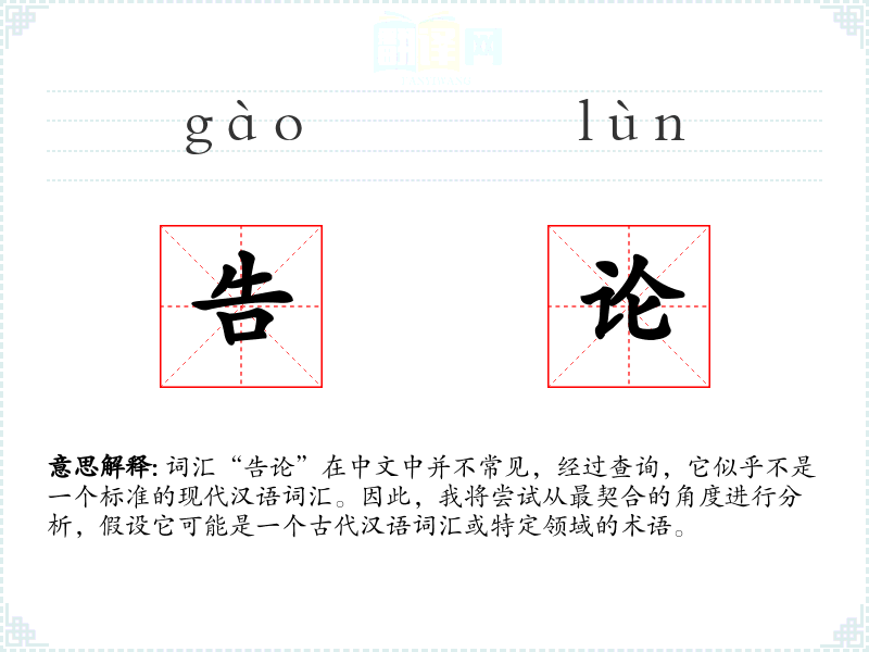 “告论”可能由两个字组成:“告”通常意味着告知、告诉,而“论”则意味着讨论、论述。结合起来,“告论”可能指的是告知并进行讨论的行为或过程。