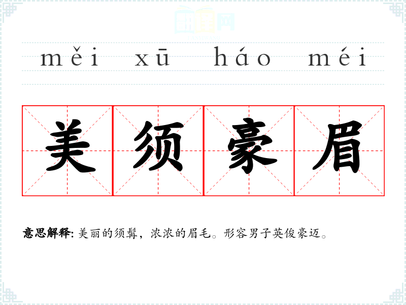 美丽的须髯,浓浓的眉毛。形容男子英俊豪迈。
