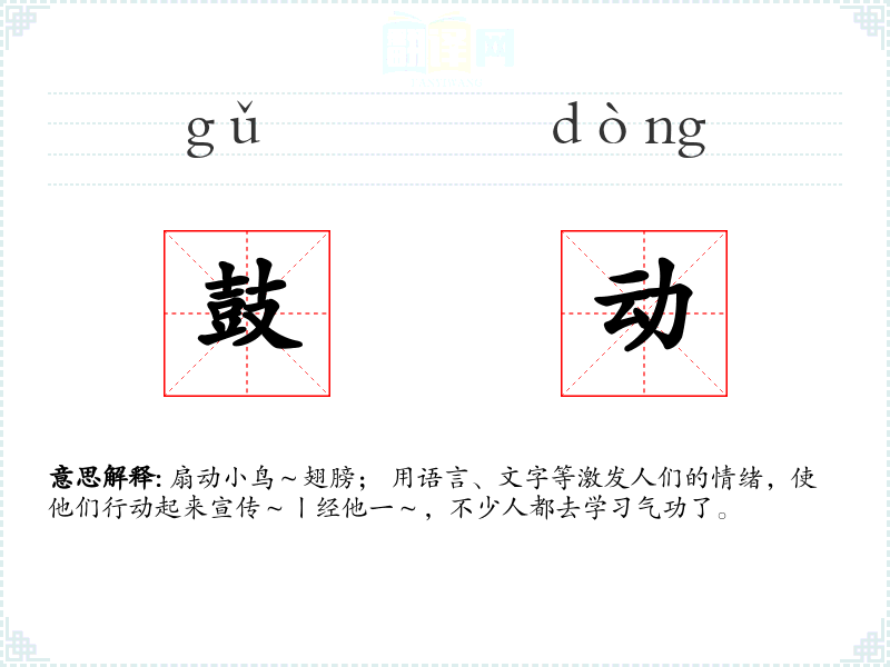 扇动小鸟~翅膀; 用语言、文字等激发人们的情绪,使他们行动起来宣传~丨经他一~,不少人都去学习气功了。