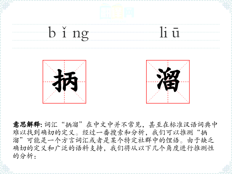 词汇“抦溜”在中文中并不常见,甚至在标准汉语词典中难以找到确切的定义。经过一番搜索和分析,我们可以推测“抦溜”可能是一个方言词汇或者是某个特定社群中的俚语。由于缺乏确切的定义和广泛的语料支持,我们将从以下几个角度进行推测性的分析:
