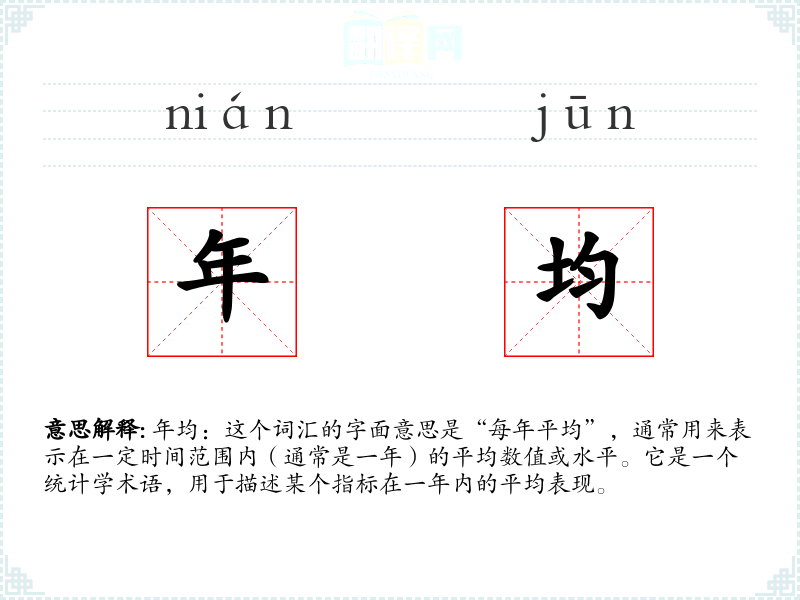 年均:这个词汇的字面意思是“每年平均”,通常用来表示在一定时间范围内(通常是一年)的平均数值或水平。它是一个统计学术语,用于描述某个指标在一年内的平均表现。