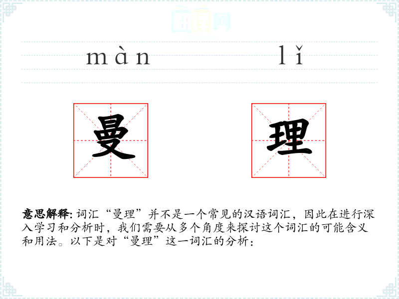 词汇“曼理”并不是一个常见的汉语词汇,因此在进行深入学习和分析时,我们需要从多个角度来探讨这个词汇的可能含义和用法。以下是对“曼理”这一词汇的分析: