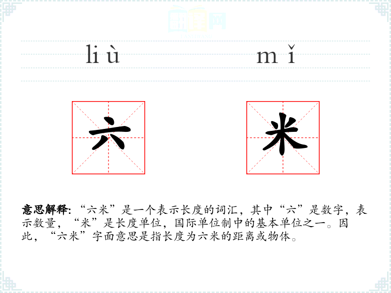 “六米”是一个表示长度的词汇,其中“六”是数字,表示数量,“米”是长度单位,国际单位制中的基本单位之一。因此,“六米”字面意思是指长度为六米的距离或物体。