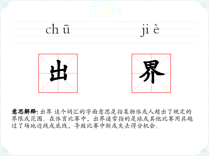 出界 这个词汇的字面意思是指某物体或人超出了规定的界限或范围。在体育比赛中,出界通常指的是球或其他比赛用具越过了场地边线或底线,导致比赛中断或失去得分机会。
