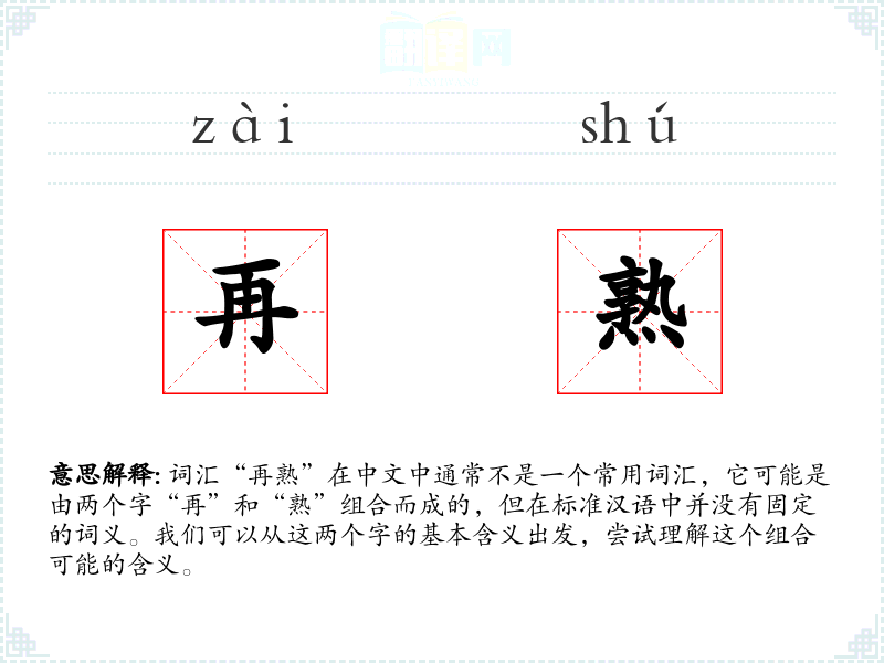 词汇“再熟”在中文中通常不是一个常用词汇,它可能是由两个字“再”和“熟”组合而成的,但在标准汉语中并没有固定的词义。我们可以从这两个字的基本含义出发,尝试理解这个组合可能的含义。