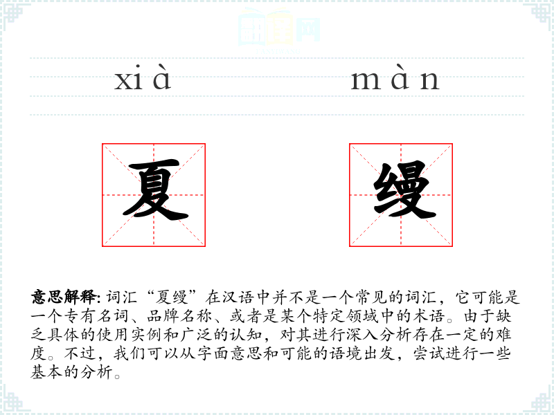 词汇“夏缦”在汉语中并不是一个常见的词汇,它可能是一个专有名词、品牌名称、或者是某个特定领域中的术语。由于缺乏具体的使用实例和广泛的认知,对其进行深入分析存在一定的难度。不过,我们可以从字面意思和可能的语境出发,尝试进行一些基本的分析。