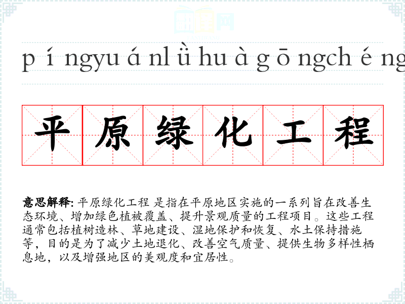 “平原绿化工程”这一词汇结合了“平原”(指地势平坦的地区)和“绿化”(指增加植被覆盖),以及“工程”(指系统性的建设项目)。随着环境保护意识的增强,这一词汇在20世纪中后期开始被广泛使用。