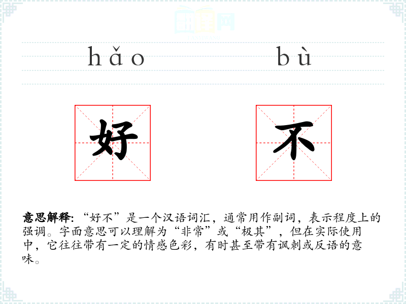 “好不”是一个汉语词汇,通常用作副词,表示程度上的强调。字面意思可以理解为“非常”或“极其”,但在实际使用中,它往往带有一定的情感色彩,有时甚至带有讽刺或反语的意味。