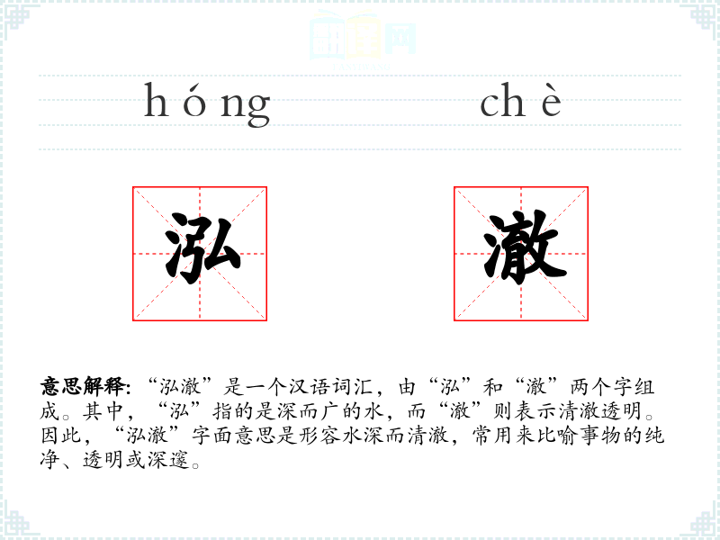 “泓”字最早见于《说文解字》,原意为深水池。“澈”字则较早见于《诗经》,意为水清。两者结合形成的“泓澈”,在古代文学中已有使用,用以形容水的清澈深邃。