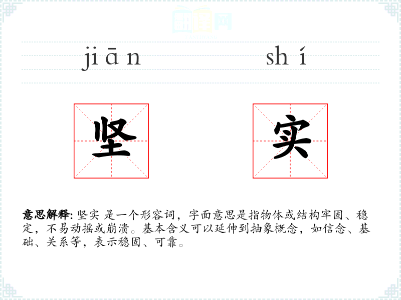 坚实 是一个形容词,字面意思是指物体或结构牢固、稳定,不易动摇或崩溃。基本含义可以延伸到抽象概念,如信念、基础、关系等,表示稳固、可靠。