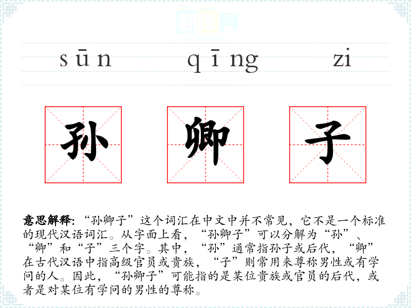 由于“孙卿子”不是一个常见的现代汉语词汇,它在不同的语境中可能会有不同的解释。在古代文献或历史记载中,它可能指的是某位具体的贵族后代或有学问的男性。在现代文学或口语中,这个词汇可能不太常用,除非是在特定的历史或文化背景下。