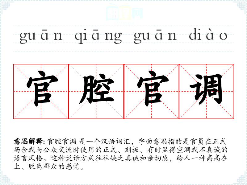 官腔官调 是一个汉语词汇,字面意思指的是官员在正式场合或与公众交流时使用的正式、刻板、有时显得空洞或不真诚的语言风格。这种说话方式往往缺乏真诚和亲切感,给人一种高高在上、脱离群众的感觉。