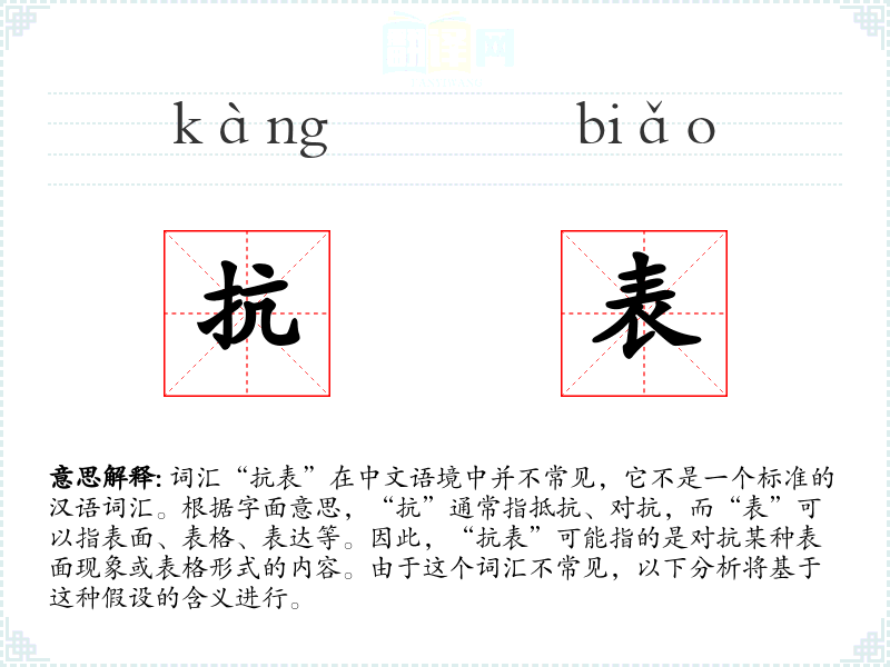 "抗表"的意思解释、抗表是什么意思由翻译网汉语词典查词提供。