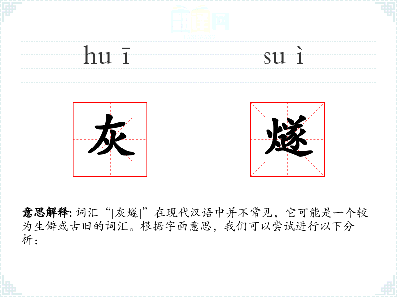 词汇“[灰燧]”在现代汉语中并不常见,它可能是一个较为生僻或古旧的词汇。根据字面意思,我们可以尝试进行以下分析: