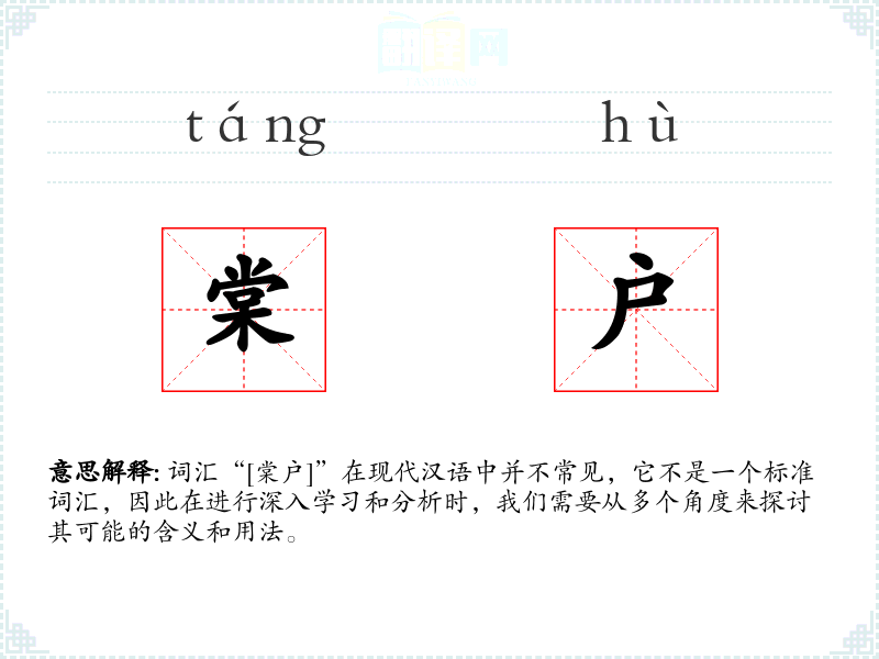 词汇“[棠户]”在现代汉语中并不常见,它不是一个标准词汇,因此在进行深入学*和分析时,我们需要从多个角度来探讨其可能的含义和用法。