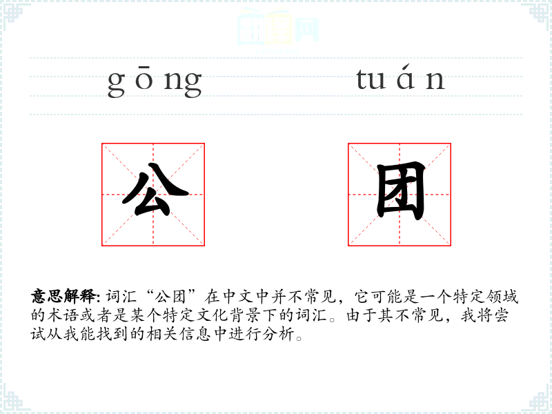 词汇“公团”在中文中并不常见,它可能是一个特定领域的术语或者是某个特定文化背景下的词汇。由于其不常见,我将尝试从我能找到的相关信息中进行分析。