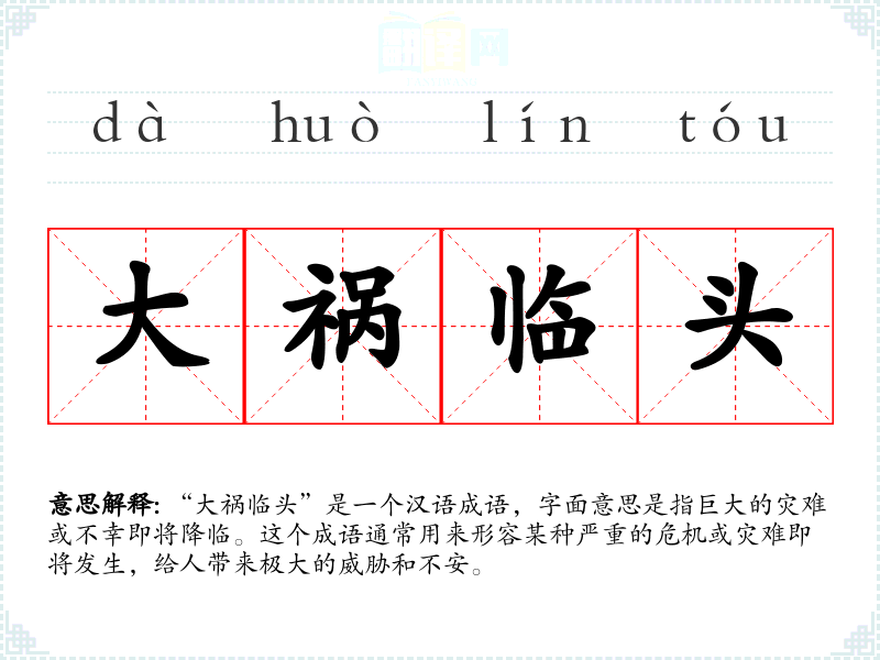 “大祸临头”是一个汉语成语,字面意思是指巨大的灾难或不幸即将降临。这个成语通常用来形容某种严重的危机或灾难即将发生,给人带来极大的威胁和不安。