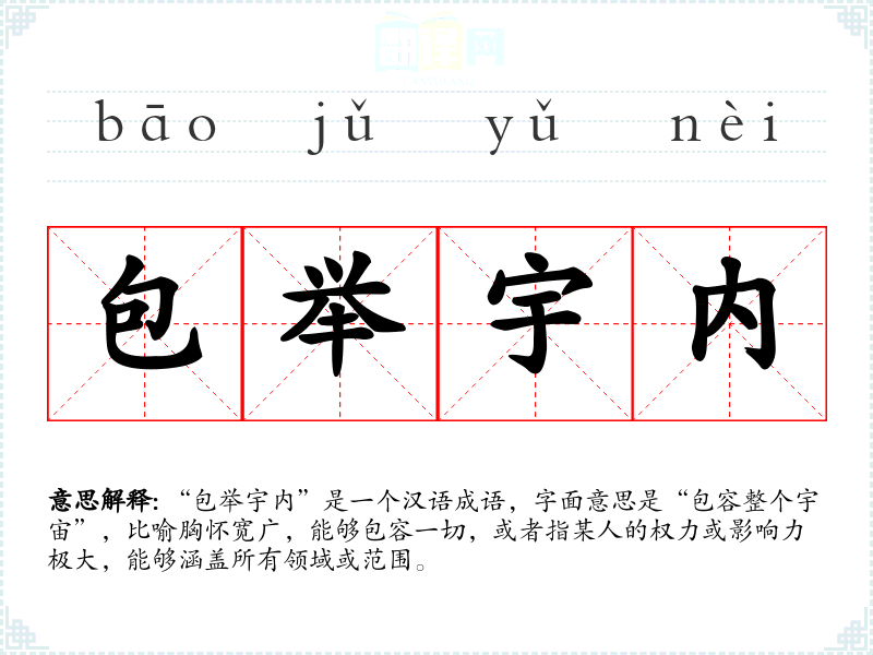 “包举宇内”是一个汉语成语,字面意思是“包容整个宇宙”,比喻胸怀宽广,能够包容一切,或者指某人的权力或影响力极大,能够涵盖所有领域或范围。