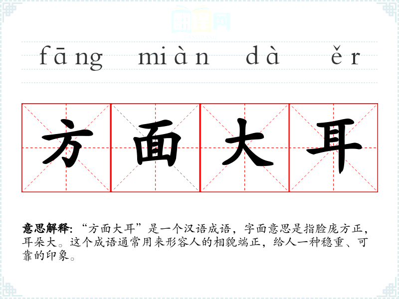 “方面大耳”是一个汉语成语,字面意思是指脸庞方正,耳朵大。这个成语通常用来形容人的相貌端正,给人一种稳重、可靠的印象。