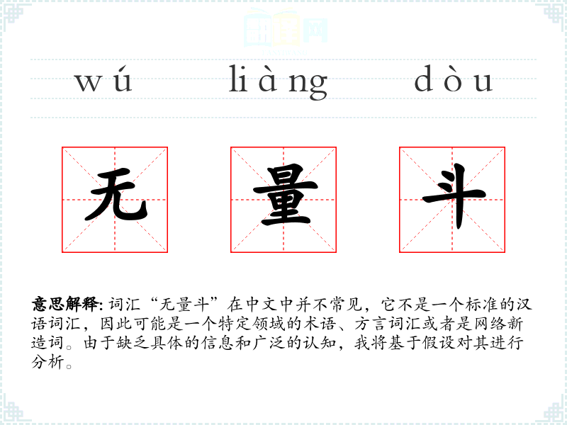 词汇“无量斗”在中文中并不常见,它不是一个标准的汉语词汇,因此可能是一个特定领域的术语、方言词汇或者是网络新造词。由于缺乏具体的信息和广泛的认知,我将基于假设对其进行分析。