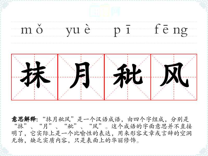 “抹月秕风”是一个汉语成语,由四个字组成,分别是“抹”、“月”、“秕”、“风”。这个成语的字面意思并不直接明了,它实际上是一个比喻性的表达,用来形容文章或言辞的空洞无物,缺乏实质内容,只是表面上的华丽修饰。