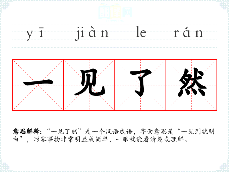 “一见了然”是一个汉语成语,字面意思是“一见到就明白”,形容事物非常明显或简单,一眼就能看清楚或理解。