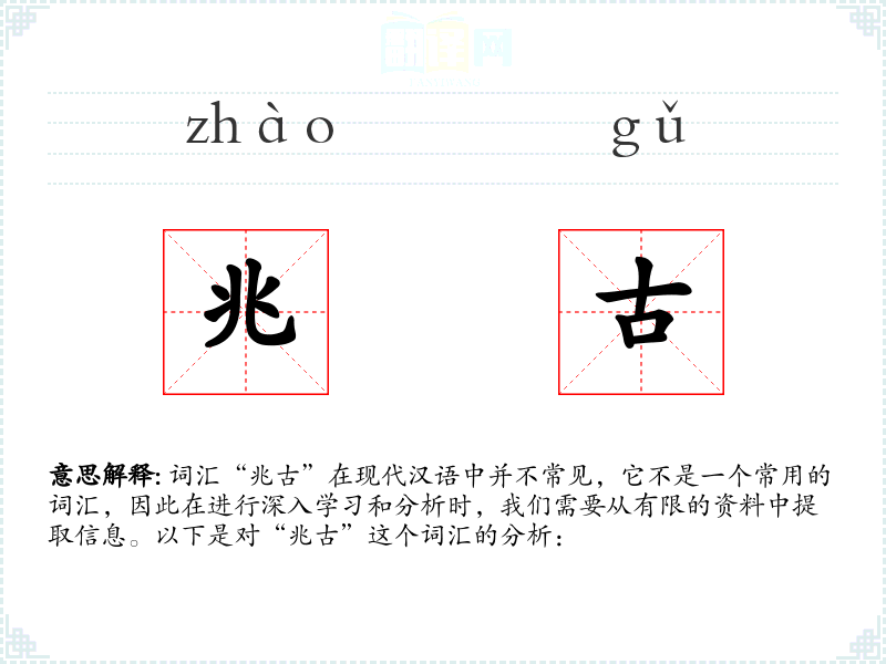 词汇“兆古”在现代汉语中并不常见,它不是一个常用的词汇,因此在进行深入学习和分析时,我们需要从有限的资料中提取信息。以下是对“兆古”这个词汇的分析: