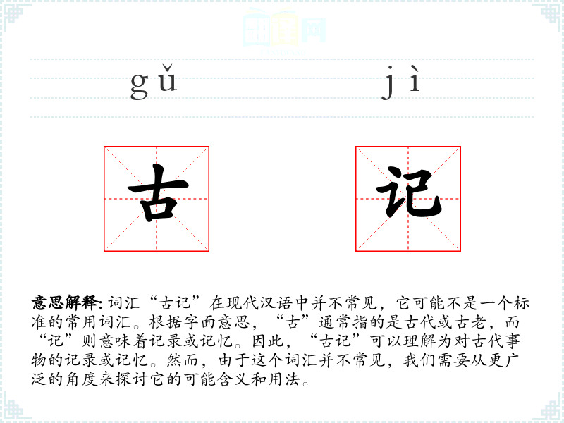 词汇“古记”在现代汉语中并不常见,它可能不是一个标准的常用词汇。根据字面意思,“古”通常指的是古代或古老,而“记”则意味着记录或记忆。因此,“古记”可以理解为对古代事物的记录或记忆。然而,由于这个词汇并不常见,我们需要从更广泛的角度来探讨它的可能含义和用法。