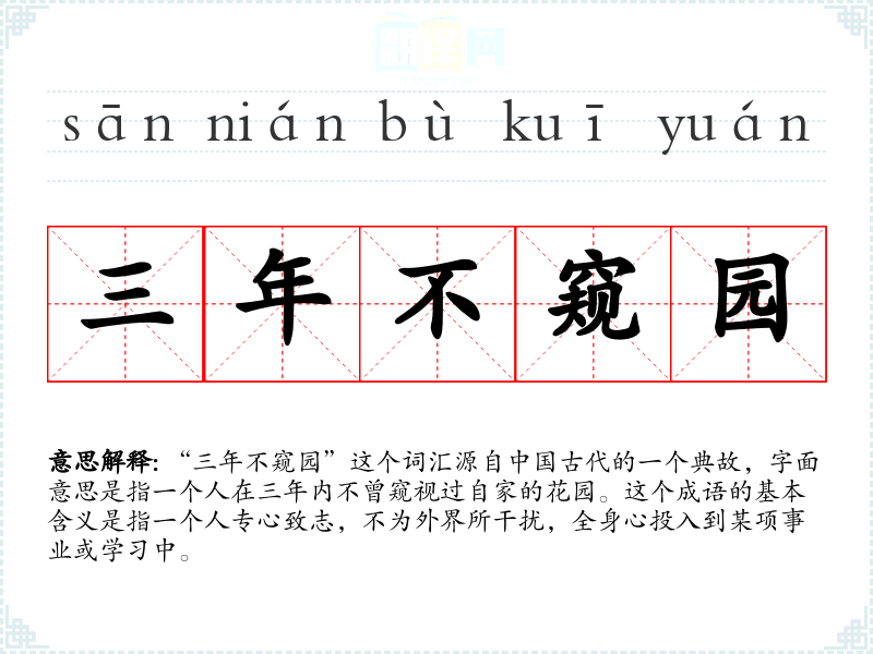 这个成语最早出自《汉书·董仲舒传》,原文是“三年不窥园”,形容董仲舒专心治学,连自家的花园都不曾去看一眼。随着时间的推移,这个成语被广泛用来形容人的专注和毅力。