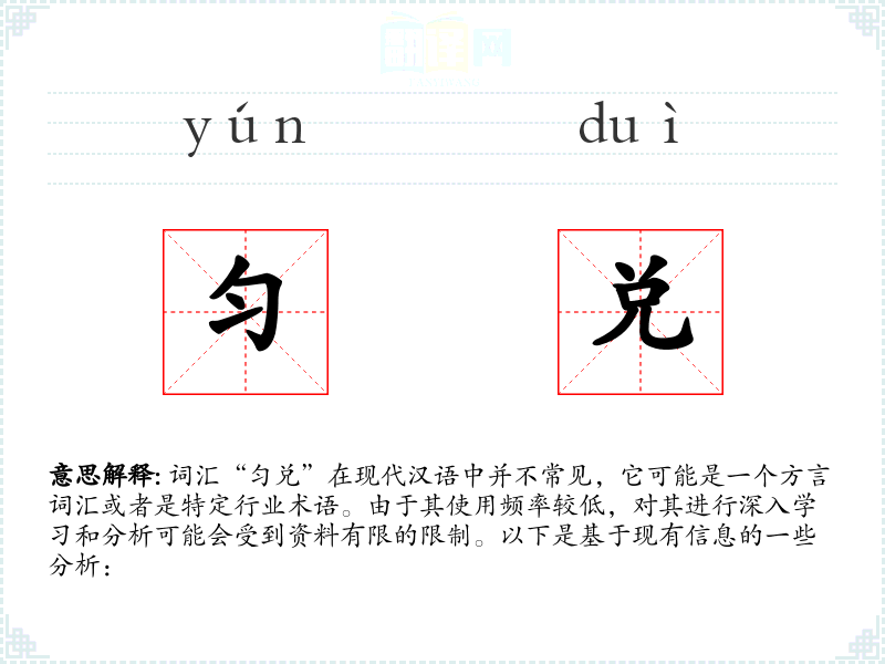 由于“匀兑”不是一个标准汉语词汇,其词源和演变可能与特定地区的语言习惯或行业术语有关。可能需要查阅方言词典或行业资料来获取更多信息。