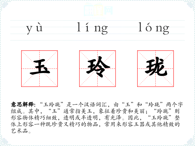“玉玲珑”是一个汉语词汇,由“玉”和“玲珑”两个字组成。其中,“玉”通常指美玉,象征着珍贵和美丽;“玲珑”则形容物体精巧细致,透明或半透明,有光泽。因此,“玉玲珑”整体上形容一种既珍贵又精巧的物品,常用来形容玉器或其他精致的艺术品。