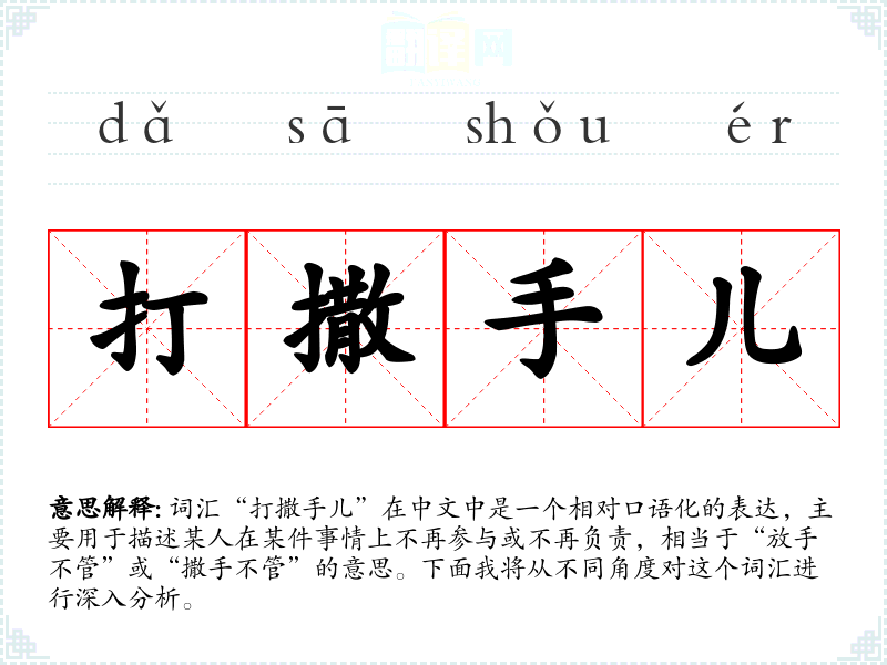 词汇“打撒手儿”在中文中是一个相对口语化的表达,主要用于描述某人在某件事情上不再参与或不再负责,相当于“放手不管”或“撒手不管”的意思。下面我将从不同角度对这个词汇进行深入分析。
