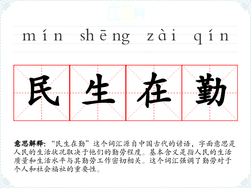“民生在勤”这个词汇源自**古代的谚语,字面意思是人民的生活状况取决于他们的勤劳程度。基本含义是指人民的生活质量和生活水平与其勤劳工作密切相关。这个词汇强调了勤劳对于个人和社会福祉的重要性。