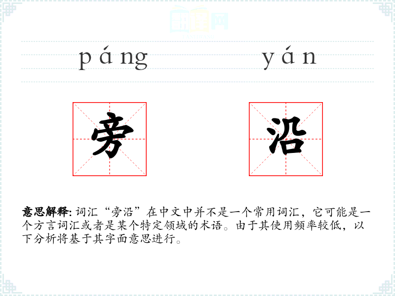 词汇“旁沿”在中文中并不是一个常用词汇,它可能是一个方言词汇或者是某个特定领域的术语。由于其使用频率较低,以下分析将基于其字面意思进行。