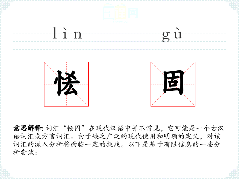 词汇“恡固”在现代汉语中并不常见,它可能是一个古汉语词汇或方言词汇。由于缺乏广泛的现代使用和明确的定义,对该词汇的深入分析将面临一定的挑战。以下是基于有限信息的一些分析尝试: