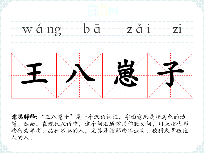 “王八崽子”是一个汉语词汇,字面意思是指乌龟的幼崽。然而,在现代汉语中,这个词汇通常用作贬义词,用来指代那些行为卑劣、品行不端的人,尤其是指那些不诚实、狡猾或背叛他人的人。
