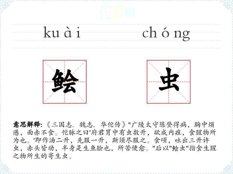 1.《三国志.魏志.华佗传》"广陵太守陈登得病,胸中烦懑,面赤不食。佗脉之曰'府君胃中有虫数升,欲成内疽,食腥物所为也。'即作汤二升,先服一升,斯须尽服之。食顷,吐出三升许虫,赤头皆动,半身是生鱼脍也,所苦便愈。"后以"鲙虫"指食生腥之物所生的寄生虫。