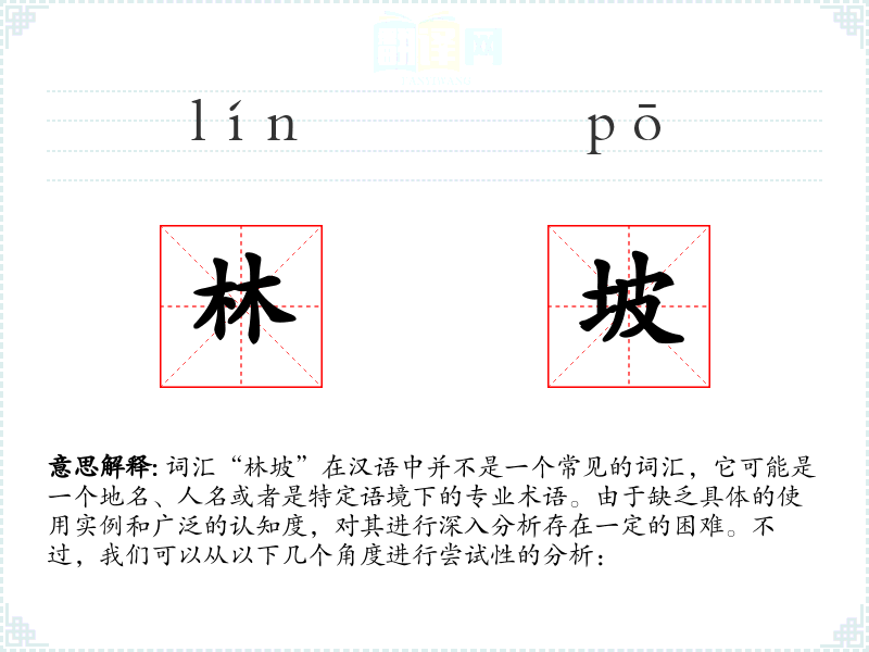 词汇“林坡”在汉语中并不是一个常见的词汇,它可能是一个地名、人名或者是特定语境下的专业术语。由于缺乏具体的使用实例和广泛的认知度,对其进行深入分析存在一定的困难。不过,我们可以从以下几个角度进行尝试性的分析: