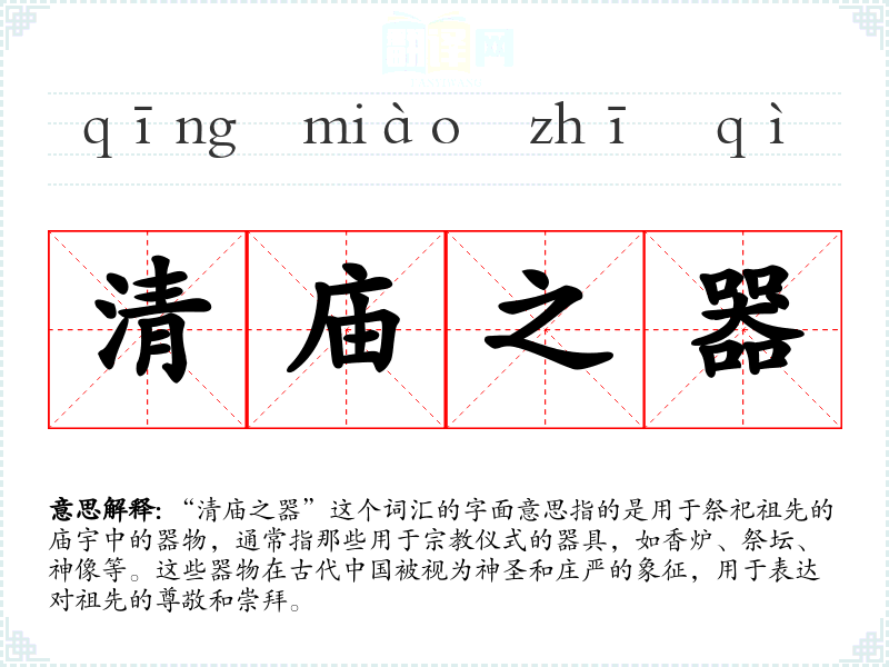 “清庙之器”这个词汇的字面意思指的是用于祭祀祖先的庙宇中的器物,通常指那些用于仪式的器具,如香炉、祭坛、神像等。这些器物在古代被视为神圣和庄严的象征,用于表达对祖先的尊敬和崇拜。