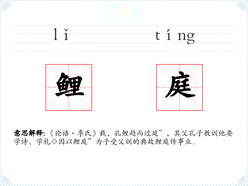 《论语·季氏》载,孔鲤趋而过庭”,其父孔子教训他要学诗、学礼◇因以鲤庭”为子受父训的典故鲤庭传事业。