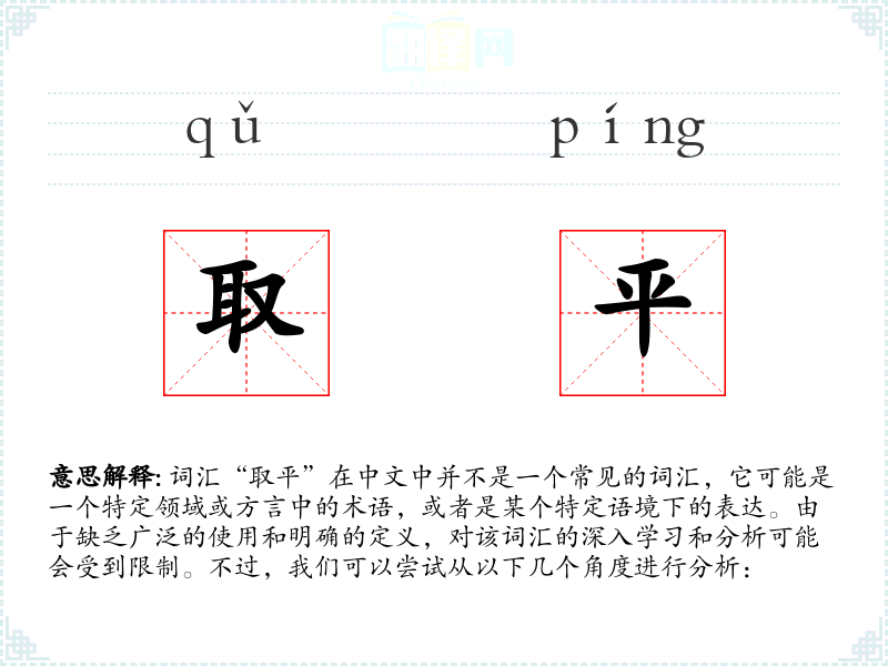 由于“取平”不是一个常见词汇,对其的理解和应用可能非常有限。在语言学习和表达中,了解特定领域或方言中的术语是重要的,但“取平”作为一个词汇,其使用和理解可能需要更多的上下文信息。