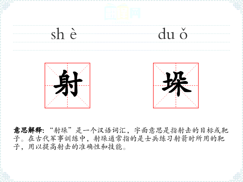 - 反义词:无(因为射垛是一个具体的名词,没有直接的反义词)