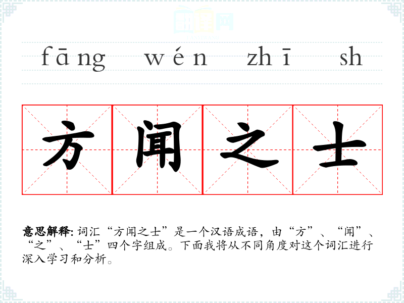 词汇“方闻之士”是一个汉语成语,由“方”、“闻”、“之”、“士”四个字组成。下面我将从不同角度对这个词汇进行深入学*和分析。