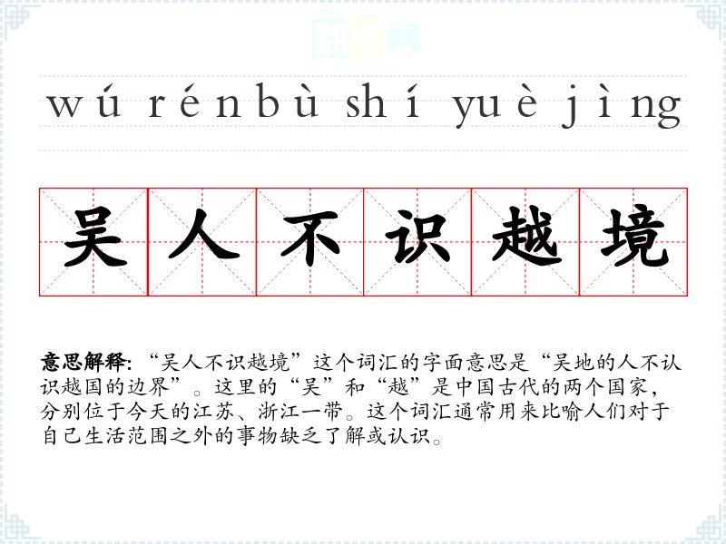 “吴人不识越境”这个词汇的字面意思是“吴地的人不认识越国的边界”。这里的“吴”和“越”是**古代的两个国家,分别位于今天的江苏、浙江一带。这个词汇通常用来比喻人们对于自己生活范围之外的事物缺乏了解或认识。