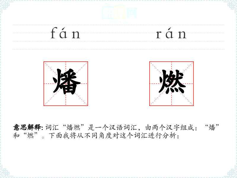 词汇“燔燃”是一个汉语词汇,由两个汉字组成:“燔”和“燃”。下面我将从不同角度对这个词汇进行分析: